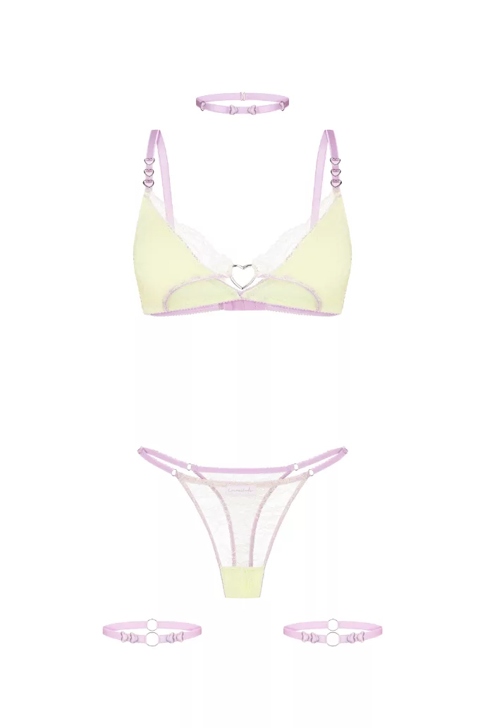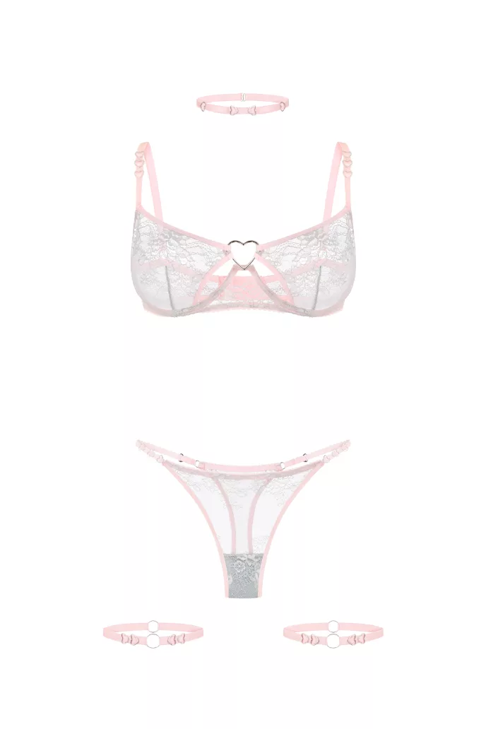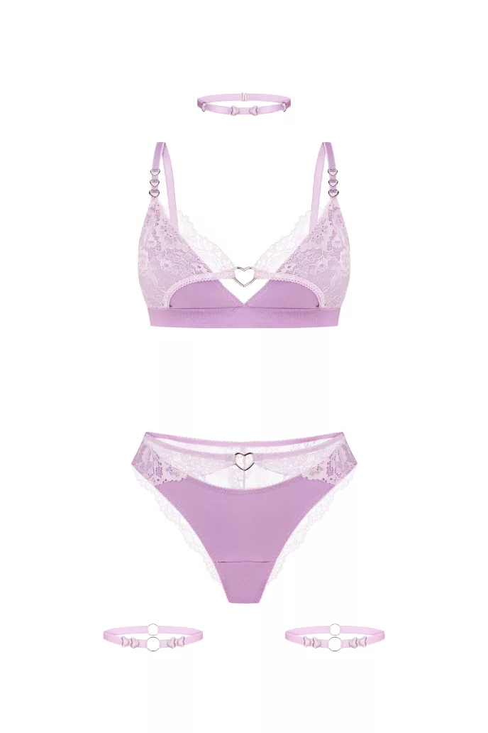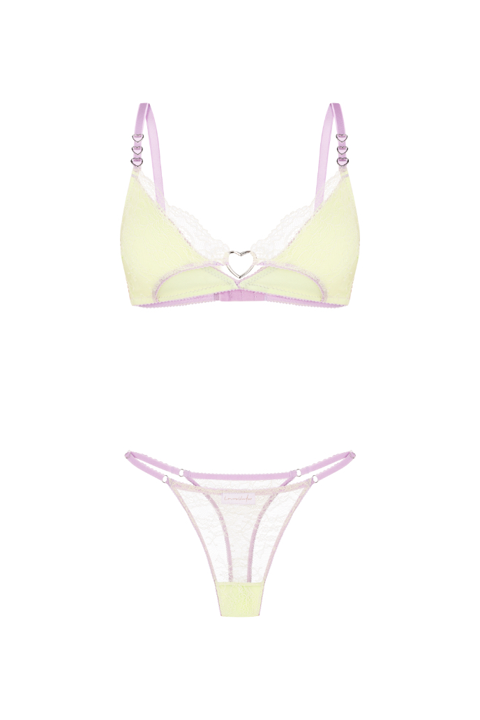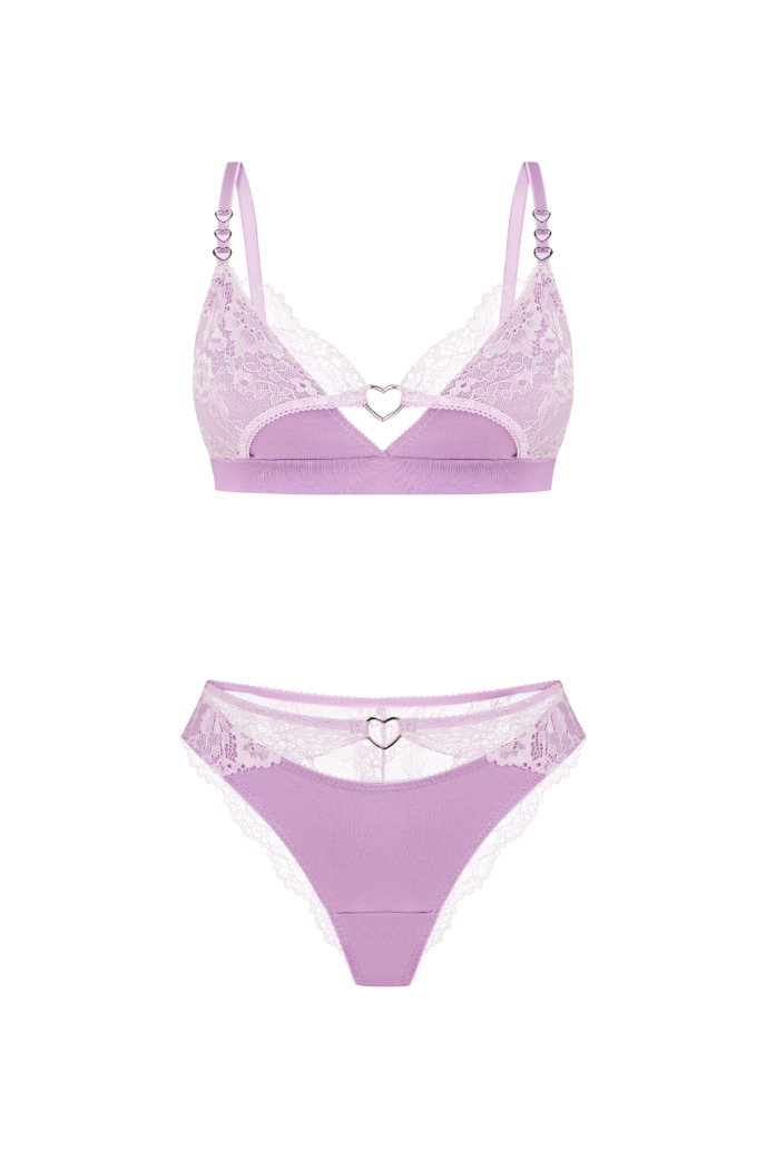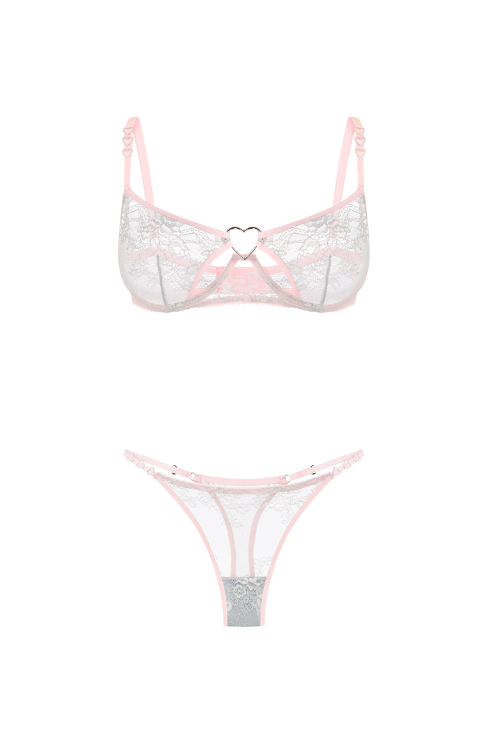 Бра Amore виконаний із сатину – ліф фантазійної форми на каркасах, доповнений фурнітурою у формі серця.