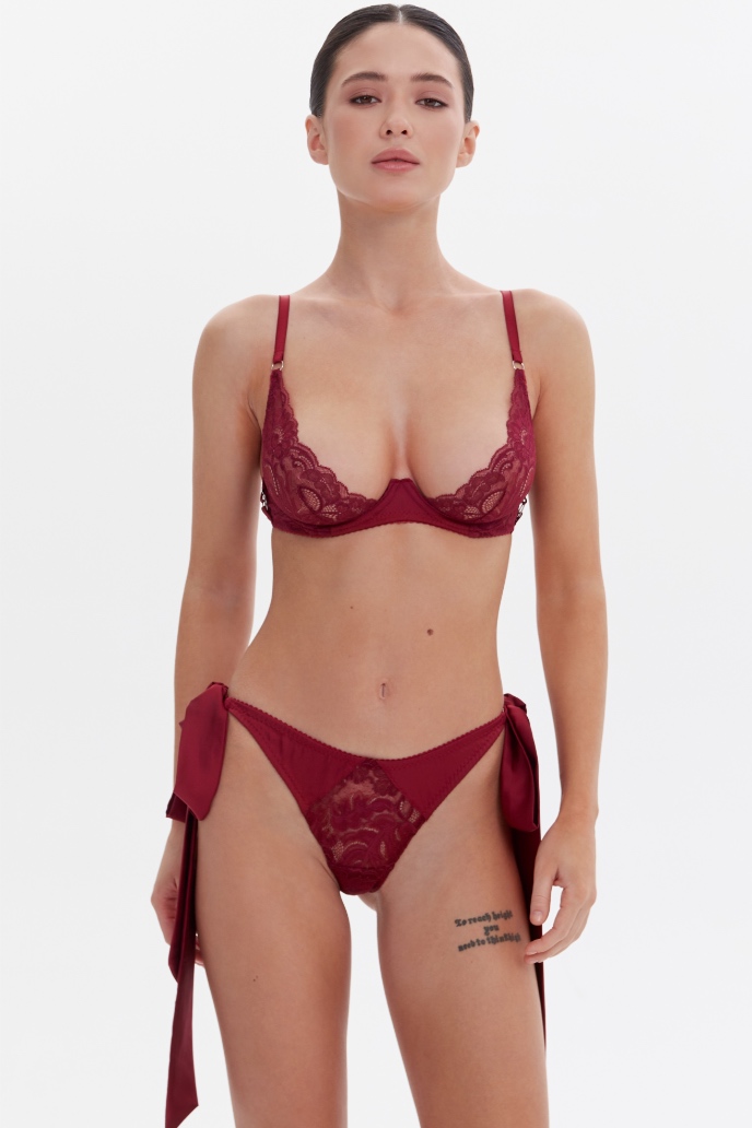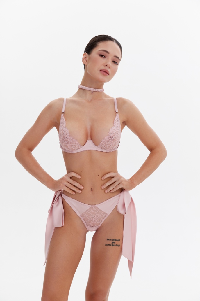 До сету входять бра на каркасах, трусики стрінг із боковою регуляцією, три зйомні сатинові стрічки, які можна кріпити до комплекту, а також чокер.