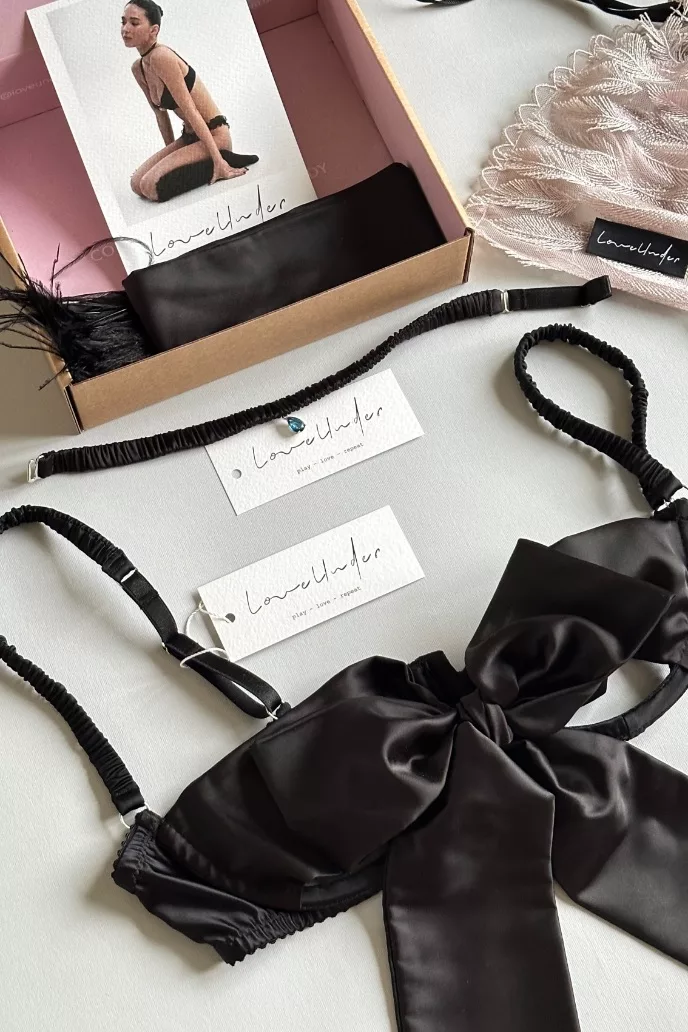 До набору також входить стрічка із пірʼям та подарунковий мішечок для зберігання білизни з пір’ям.