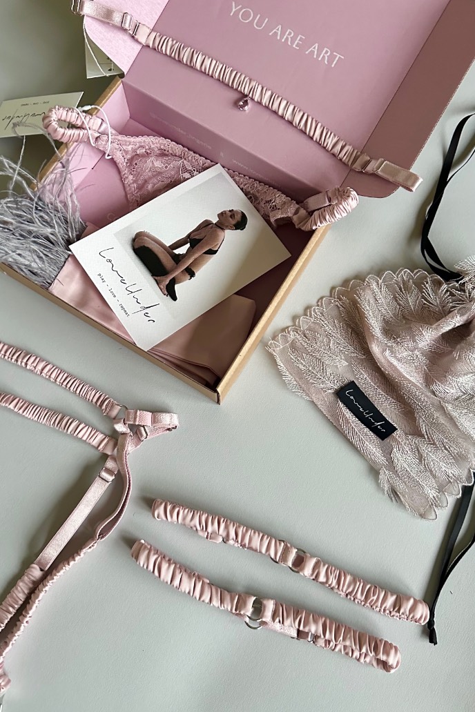 До набору також входить стрічка із пірʼям та подарунковий мішечок для зберігання білизни з пір’ям.