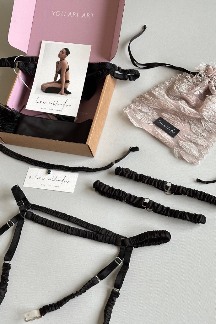 Подарунковий набір PlayLouder №2 складається з трусиків стрінг, поясу, гартерів на ніжки та чокера на шию.
