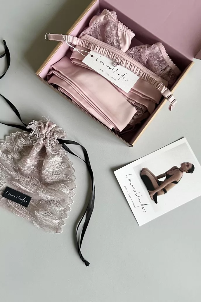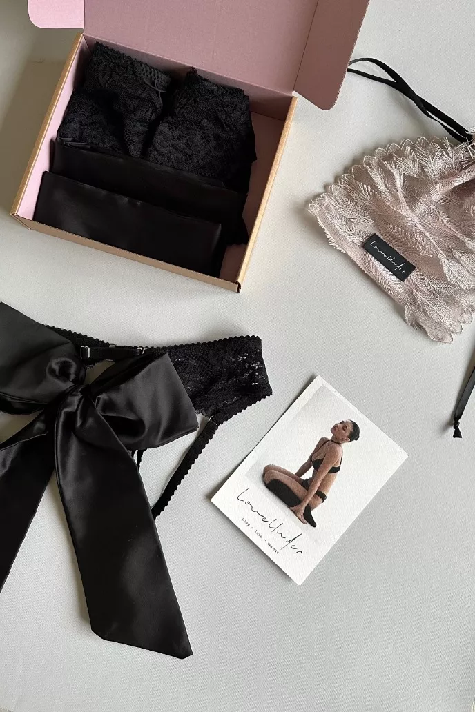 До набору також входять дві зйомні сатинові стрічки, які можна легко кріпити або знімати залежно від образу, а також подарунковий мішечок для зберігання білизни з пір’ям.