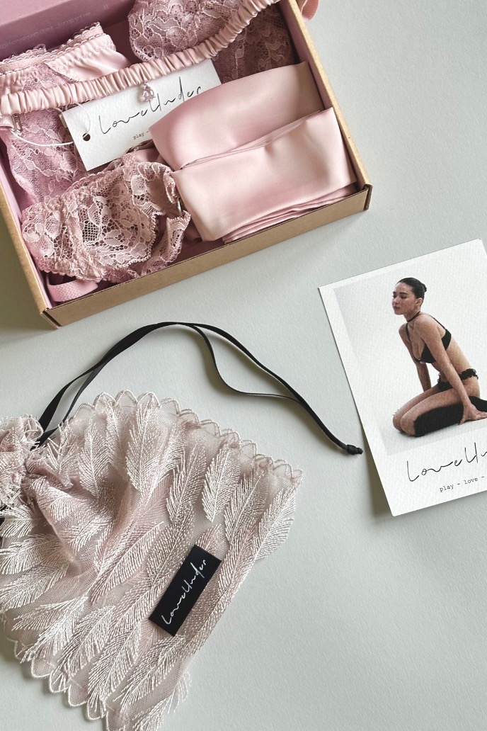 До набору також входять дві зйомні сатинові стрічки, які можна легко кріпити або знімати залежно від образу, а також подарунковий мішечок для зберігання білизни з пір’ям.