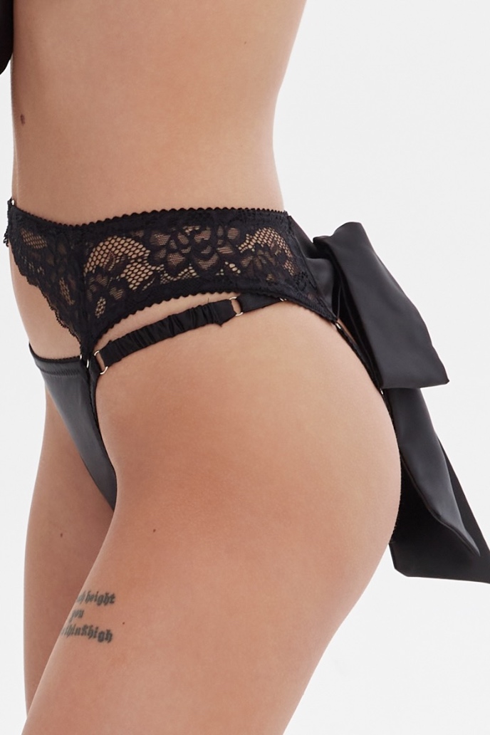 Трусики Checkmate Open з відкритим доступом мають ремінці для регулювання на сідницях та стрічку для зав’язування на бант. Виконані із мережива та сатину. Їх можна носити окремо або поверх стрінгів, як показано на фото.